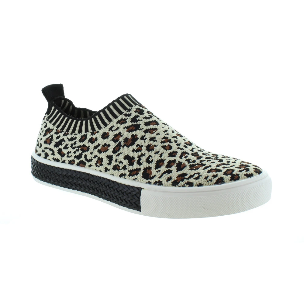 A casual and comfortable Bernie Mev slip-on with a fun leopard knit upper. The details on this shoe make it all the more special. The side sole features a black woven rope and the back heel has a simple tab to help ease the shoe on and off.