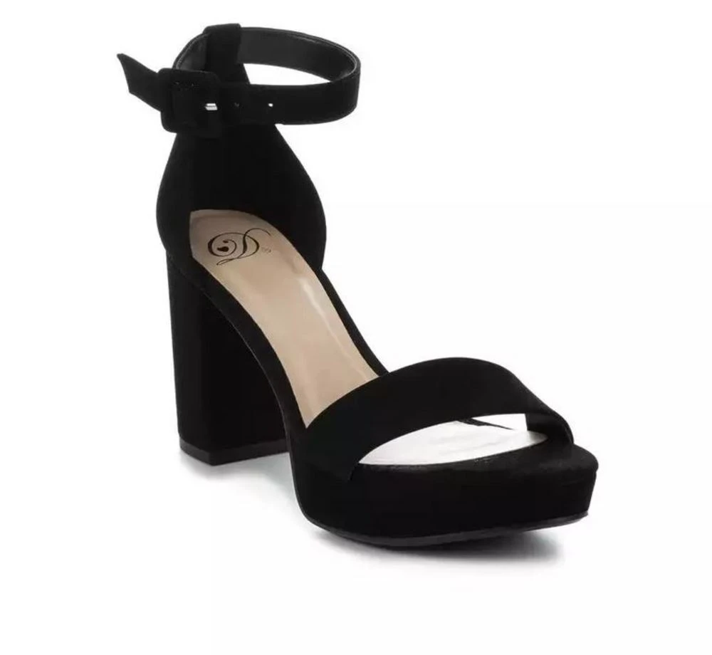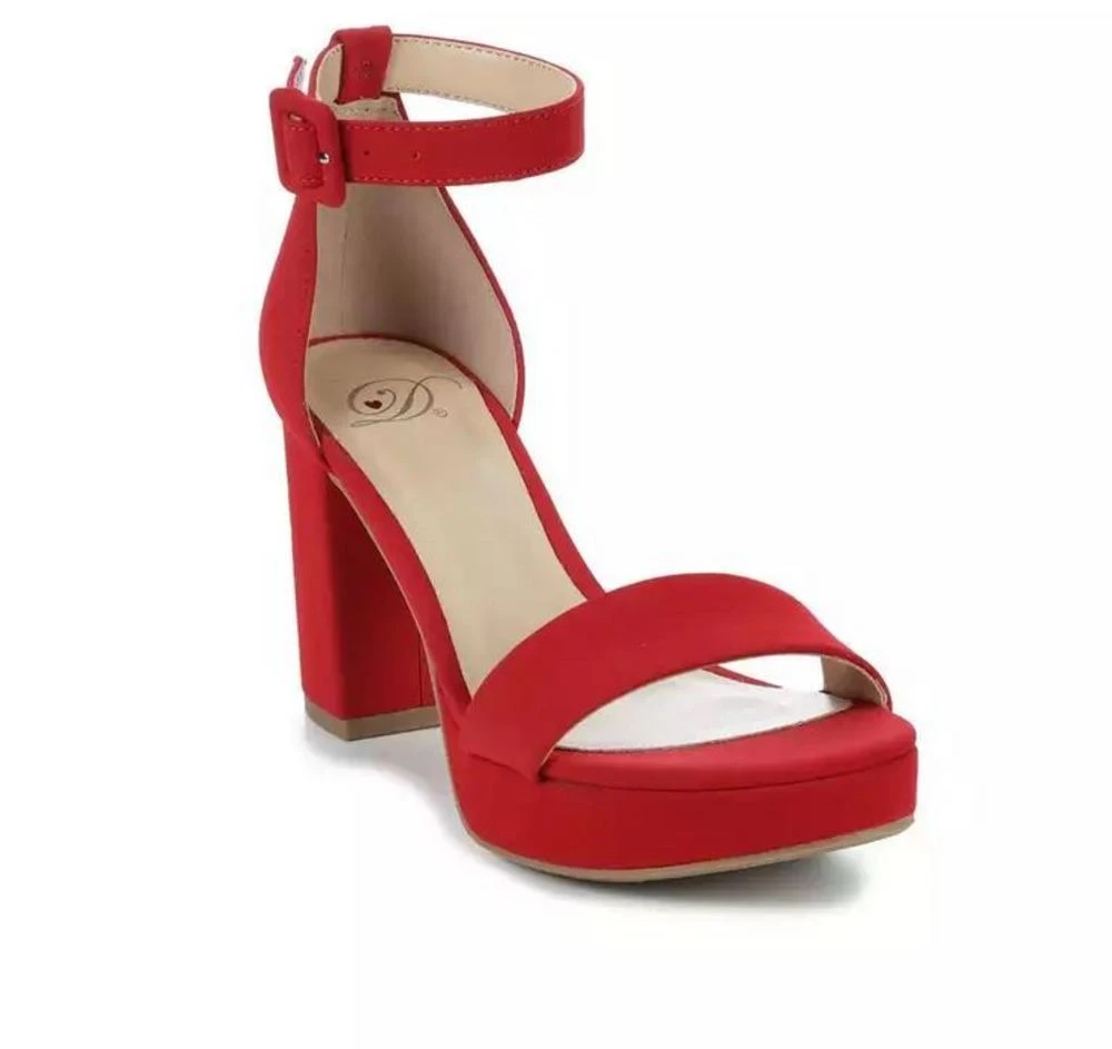 A platform dress heel for special occasions, the Century features a synthetic upper and adjustable buck strap closure. Rounded open toe and lightly padded insole for comfort. Durable outsole and a 4 1/2 inch heel height, 1 1/4 inch platform height. Synthetic suede upper (red/black.) Synthetic leather upper (dark nude.)