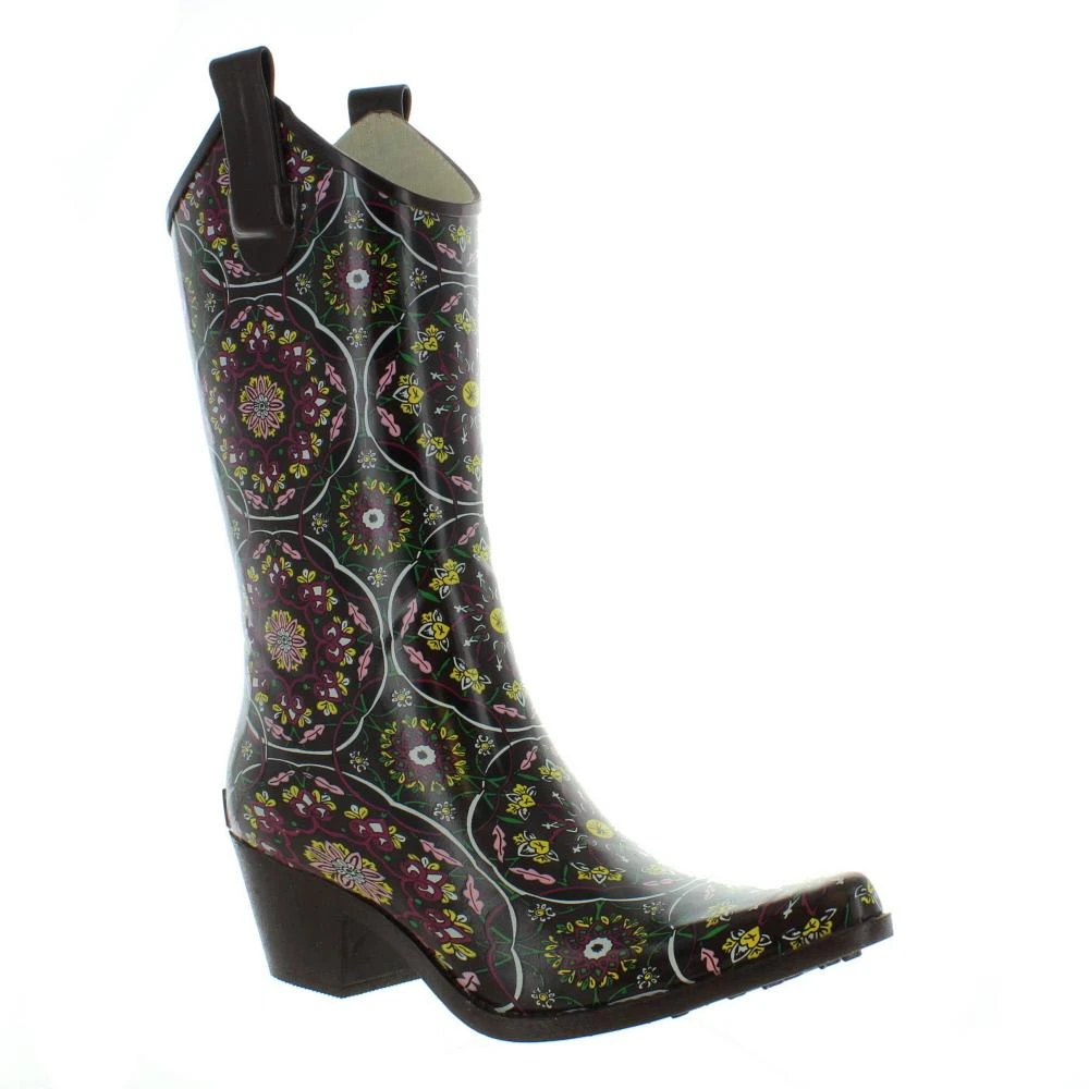 The Corkys Rodeo is a stylish western style rain boot. It is made with synthetic rubber that is waterproof. This boot is a hybrid of functionality and style featuring a pointed toe and elevated heel that will keep you dancing rain or shine.