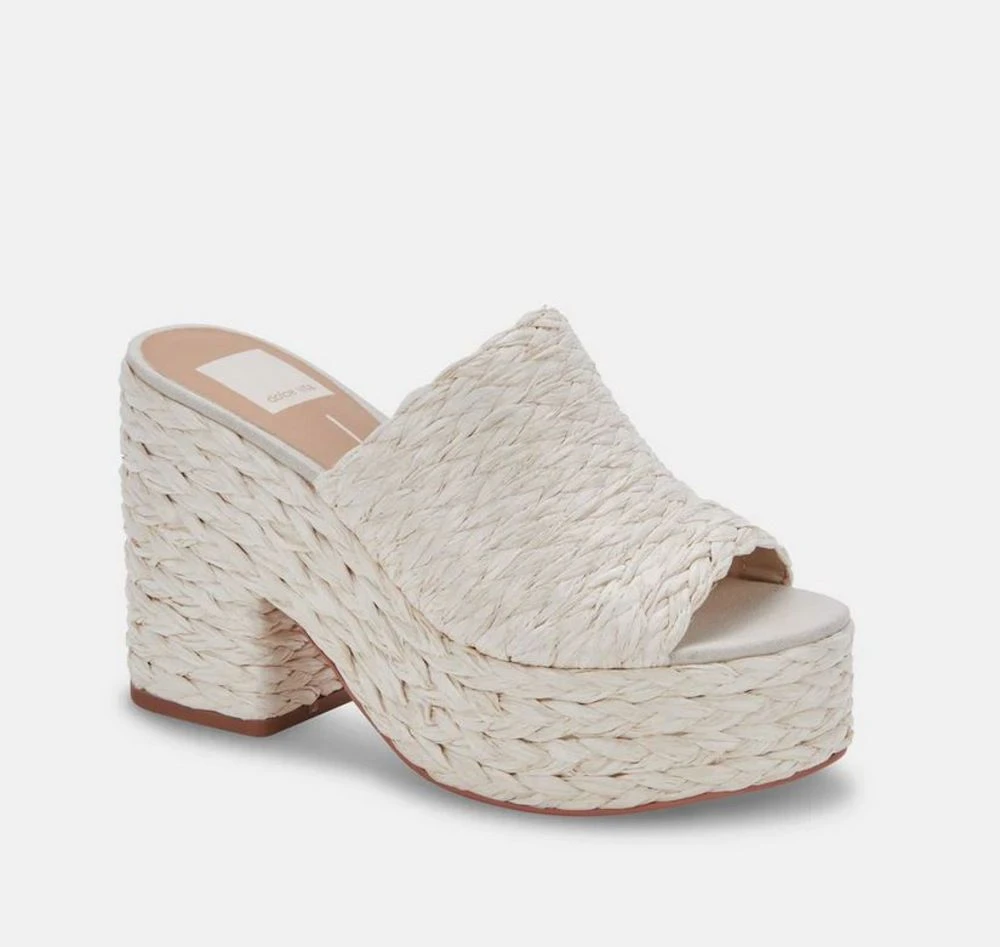 A chunky mule for the summer pairs perfectly with a maxi dress. The Elora features a recycled raffia upper and synthetic outsole. 4 inch heel and 1.5 inch platform height.