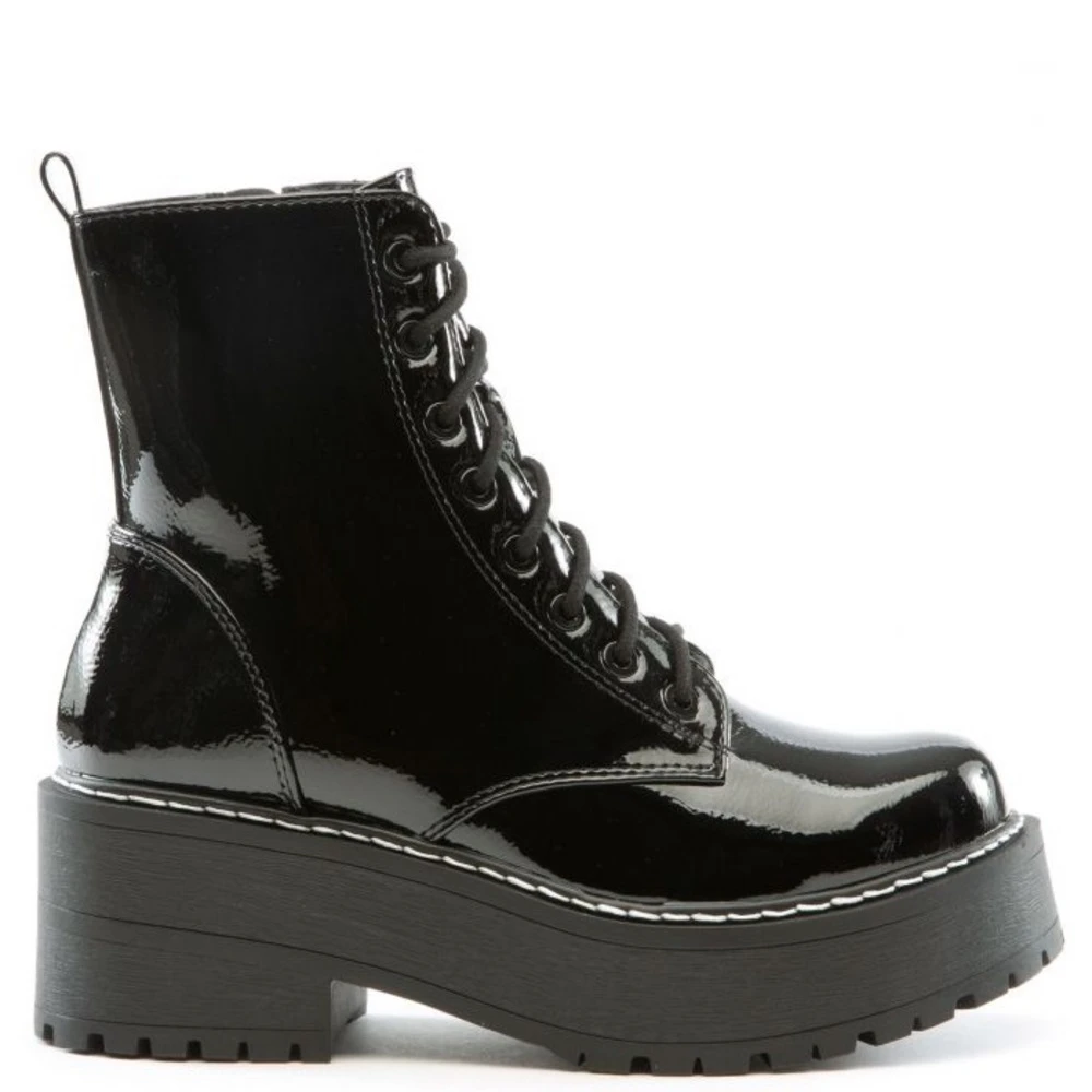 Stay stylish this fall in the Fling platform combat boot. Black boot features a patent-leather upper and white boot features a pleather upper. Side zipper and lace-up closure. Platform height of 2 inches for the perfect lift.