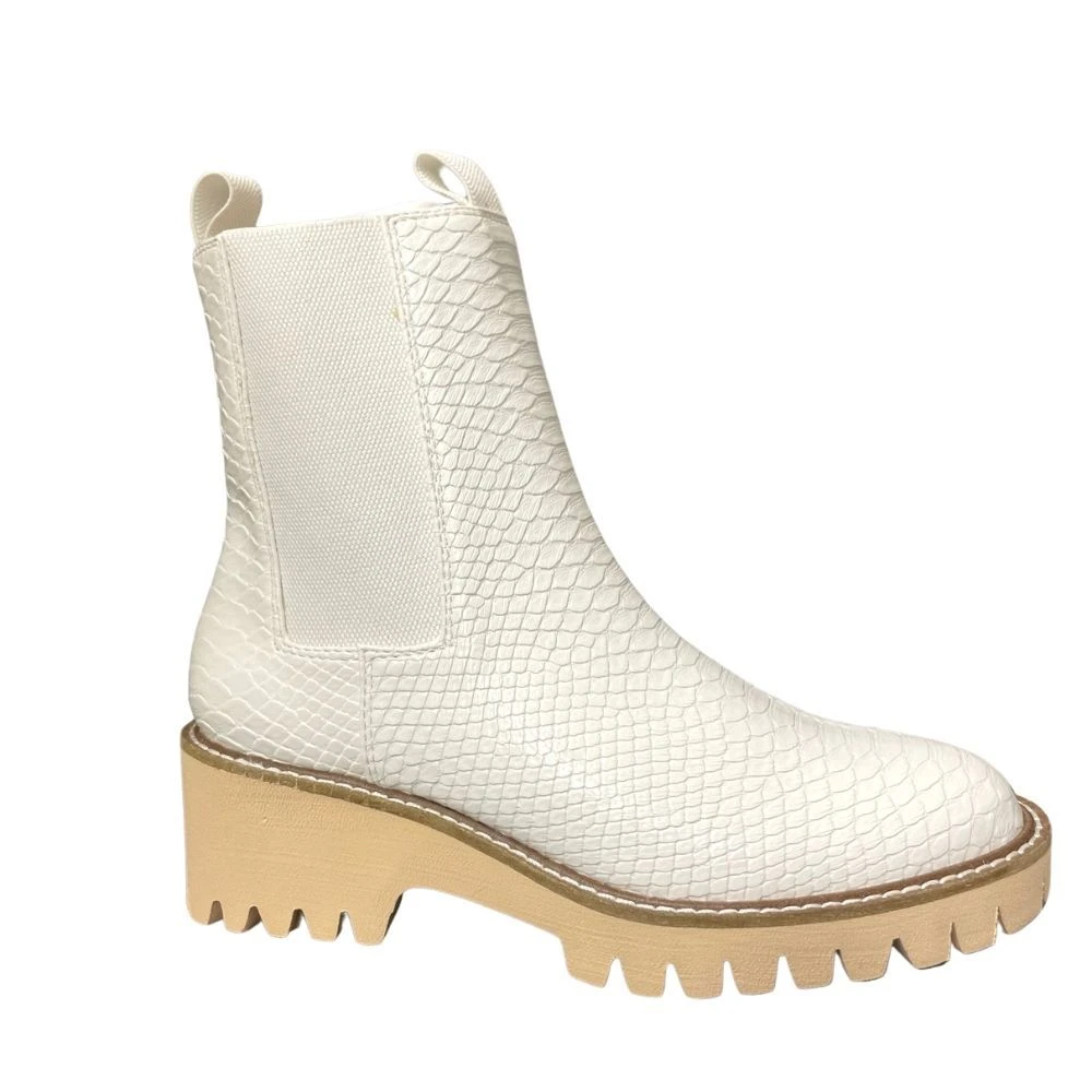 White boots are all the rage this season and the Chase bootie is the perfect pair to add to your shoe collection. Features a white snake skin texture and 1.8 inch heel. Pull tab in front and in the back for easy on and off. Pair with skinny jeans and a flannel.