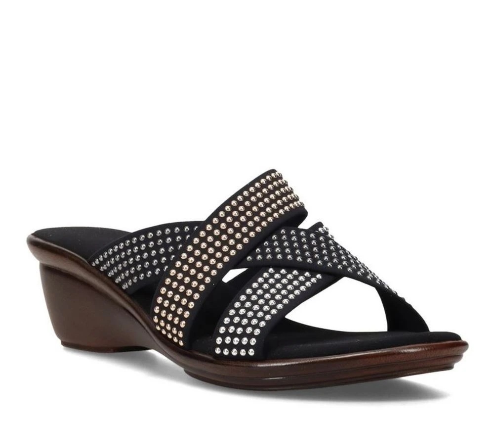 This dazzling slip-on sandal features a tonal studded upper and strappy design. A syntheitic/fabric upper with stylish metal studs and cushioned insole for all day comfort. Pair with anything from jeans to a dress. 2 1/4 inch wedge heel.