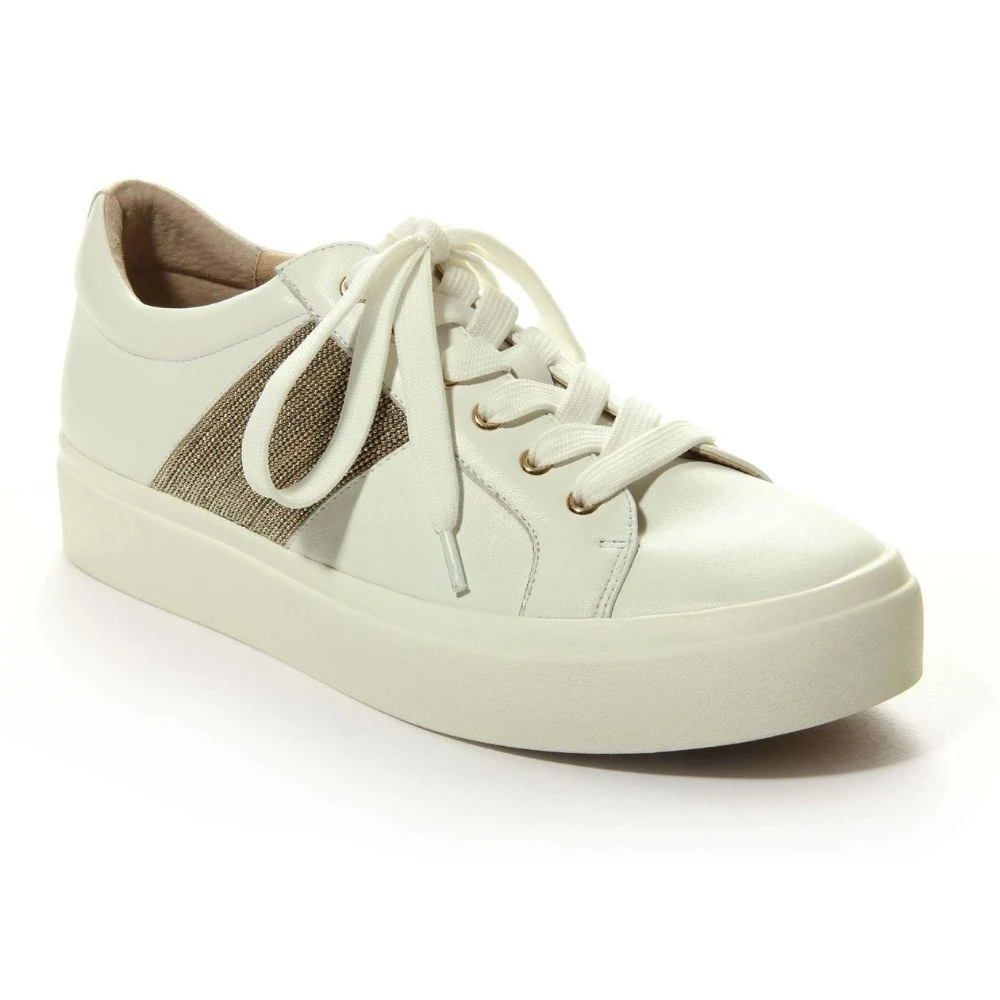 A fashion sneaker for all the fashionistas. Features a leather upper and lace-up closure. A chain-trim quarter adds a little bling to this neutral shoe and matching metal eyelets completes the look. Pair them with jeans or even a dress.